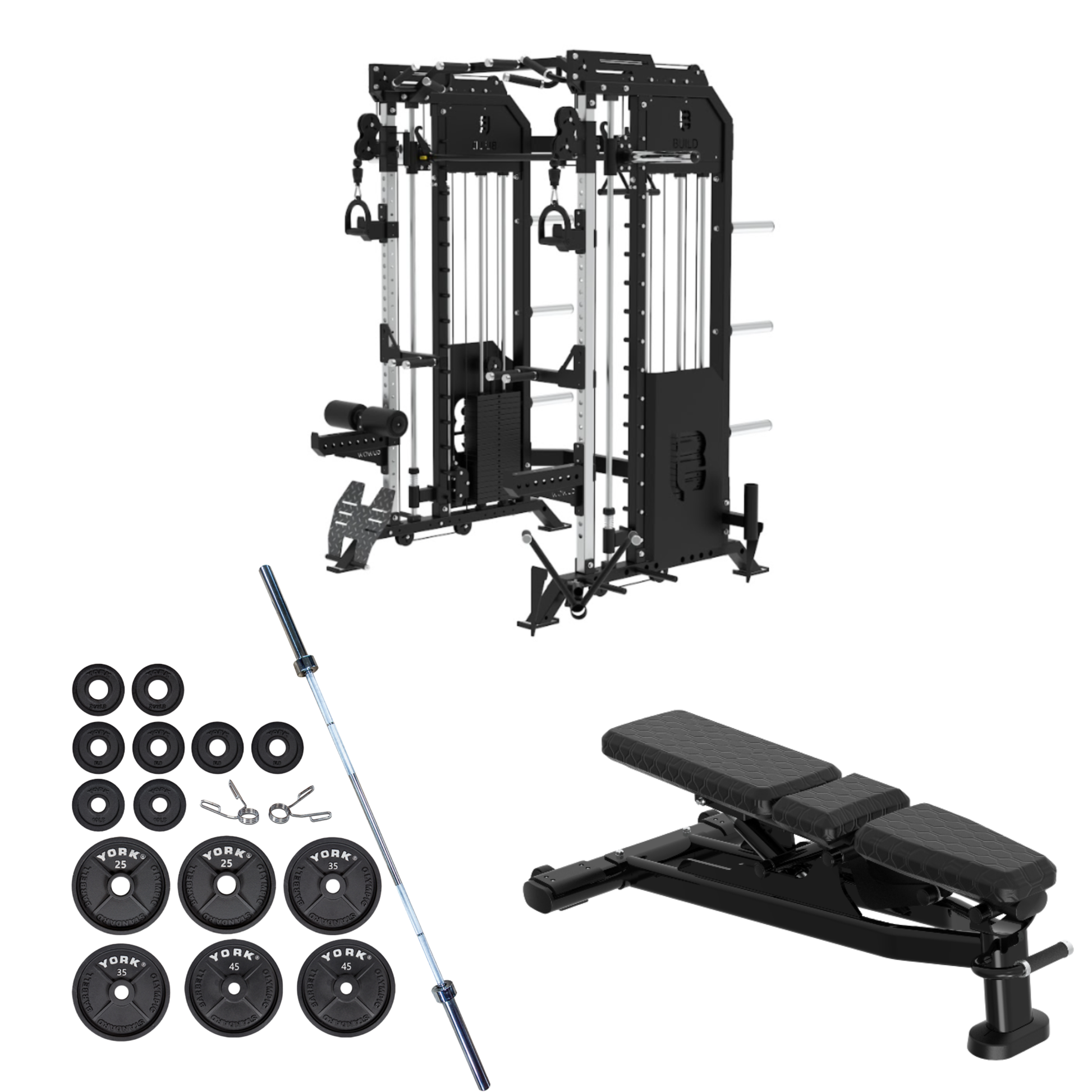 Experience the ultimate in home strength training with the Zaia Elite All-In-One Strength Bundle — a complete powerhouse system engineered for athletes who demand commercial performance, versatility, and long-term durability. This premium package includes the Zaia All-In-One Power Rack Pro, the BUILD Multi-Adjust Bench, and a full York Iron Olympic Plate Set with barbell, giving you everything you need for limitless training at home or in a professional studio.