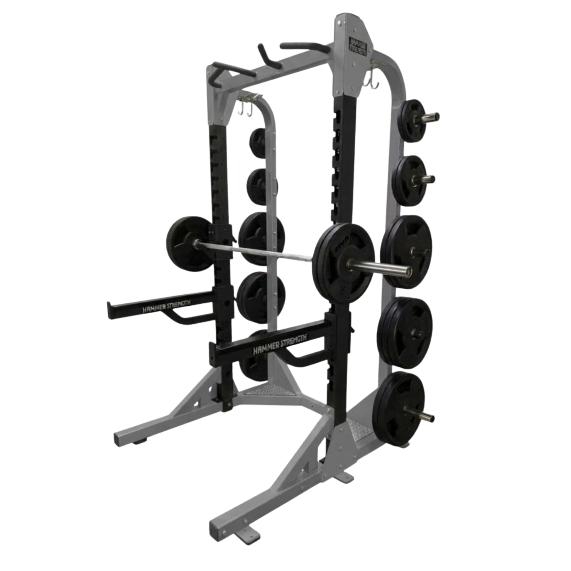 The Hammer Strength HD Elite Half Rack is a premium commercial strength training rack designed for serious lifters and high-performance training facilities. Built with heavy-duty steel construction, this rack provides a stable platform for squats, presses, pulls, and other barbell movements while maintaining a compact footprint.