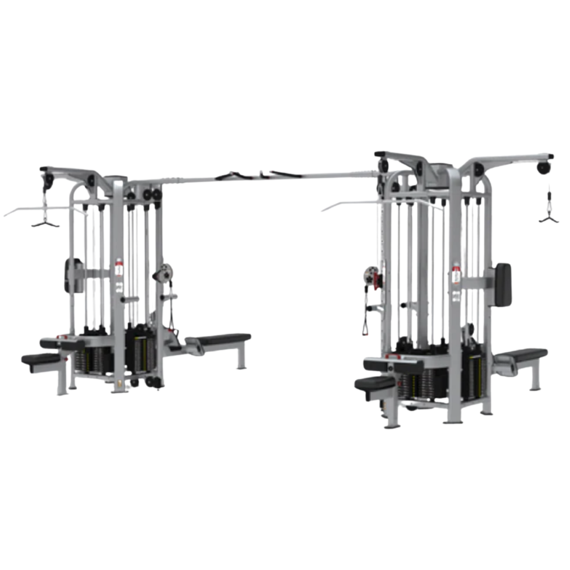 This system includes two Lat Pull Down stations, two Low Row stations, two Triceps Press stations, and a fully adjustable Cable Cross Over system, all equipped with swivel pulleys for unrestricted movement. An integrated pull-up station expands training options even further. Stabilization handles on select stations give users added balance and control during high-effort movements.
