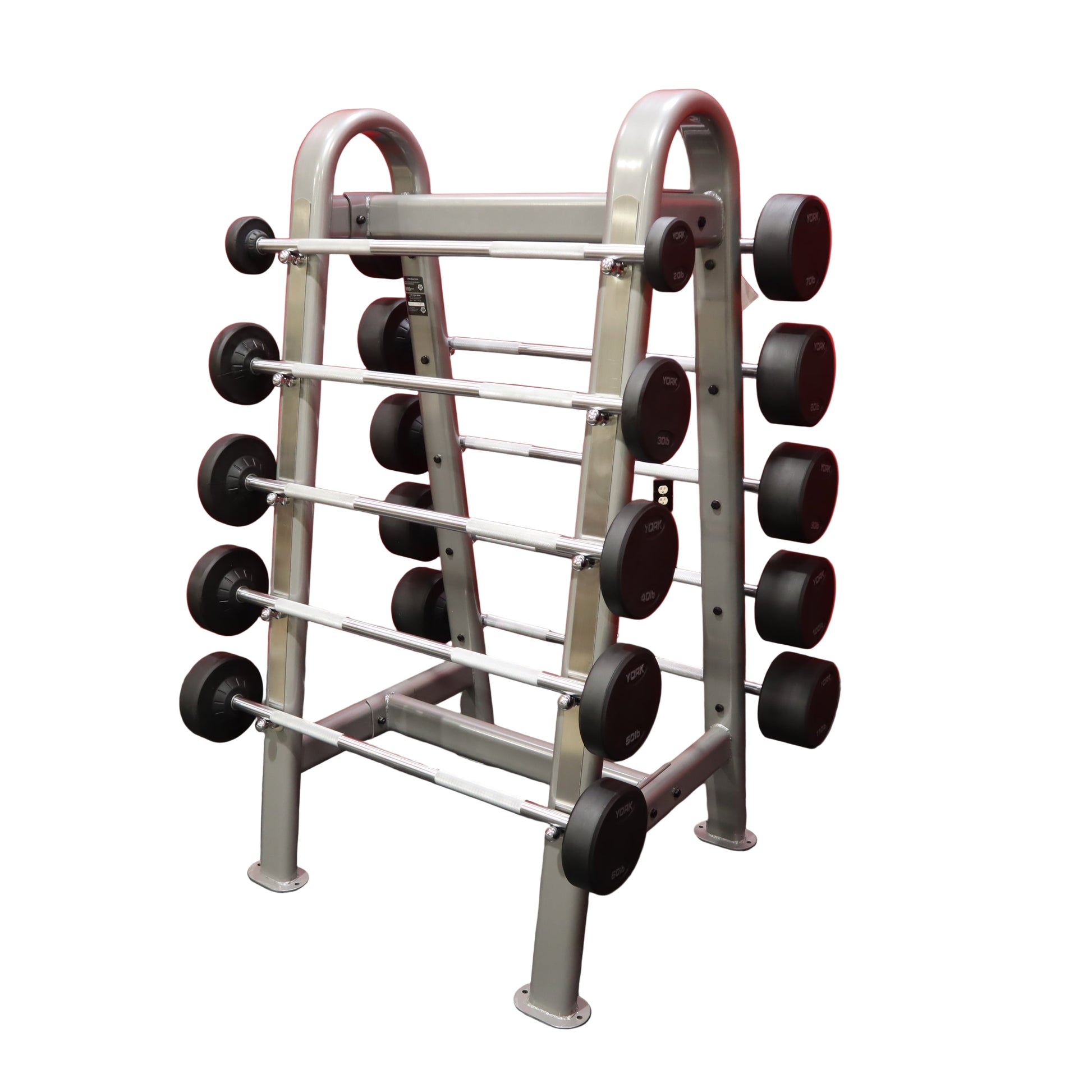- Capacity: Holds up to 10 fixed barbells, both straight and curl.